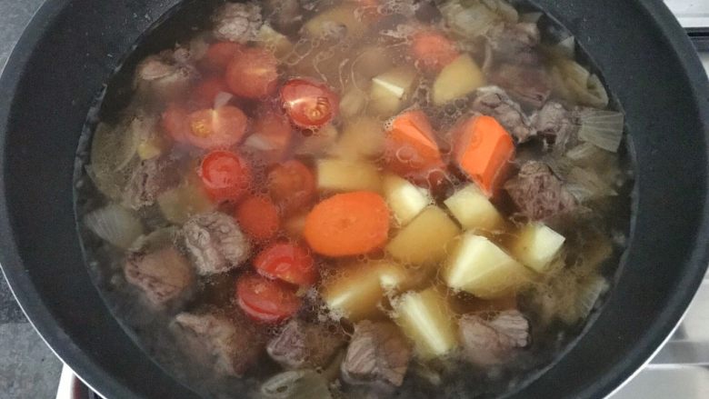 21. 当牛肉煮熟后,把土豆和胡萝卜加进来,再加入一半的西红柿,煮至2分钟,最后把剩下的一半西红柿和荷兰豆加进来,关火,用5分钟余温把后面一半的西红柿和荷兰豆焖熟,就完工啦! 接下来的是对追求完美的人来说哒……