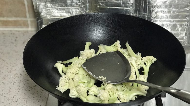 番茄花菜,用锅铲使劲按压花菜,干煸