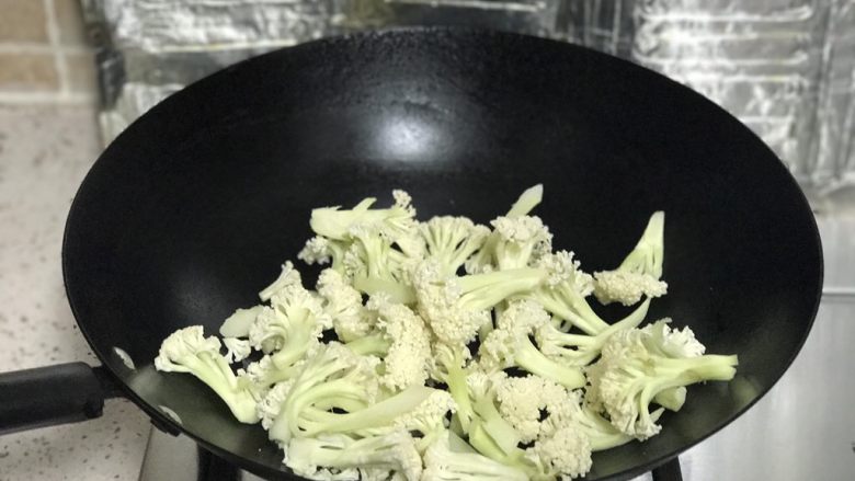 6. 待花菜煸出香味,颜色由黄变绿,将其盛起