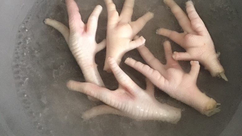 3. 锅中放水烧开后,把鸡爪放入沸水锅中焯去血水。