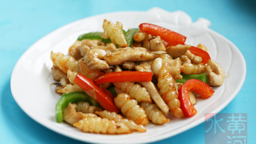 9. 放入鸡脯、甘露子及调料,翻炒均匀