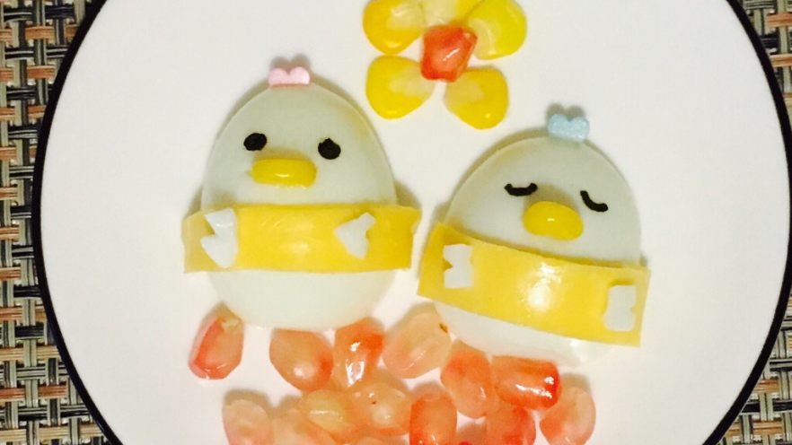 1. 鸡蛋煮熟,同时煮一小块玉米 鸡蛋过凉水剥皮 一只鸡蛋一分为二 另一只剥部分蛋清,剪出小鸡翅膀 用海苔表情器压出表情 用镊子轻轻放到鸡蛋上 在鸡蛋上剪小口 糖片做鸡冠 玉米做嘴 芝士片剪条 翅膀放在芝士片上 用玉米粒和石榴粒加以点缀 完成