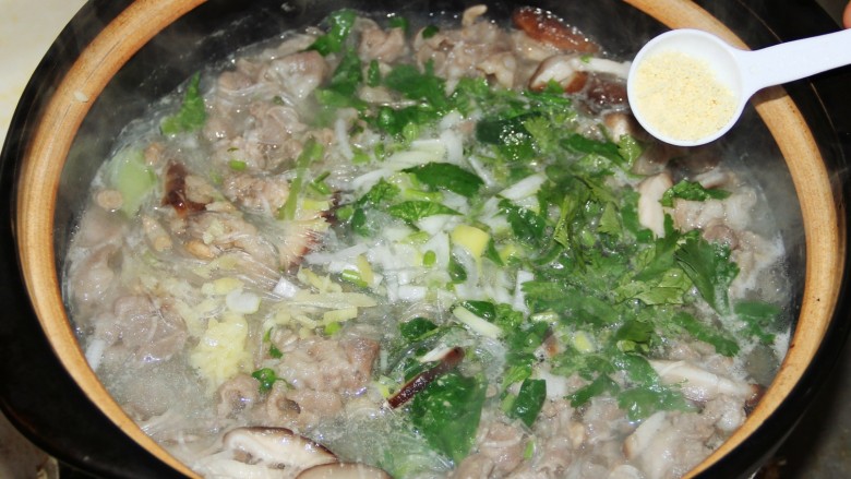 13. 关火,砂锅有余热,加入葱姜末和香菜末。