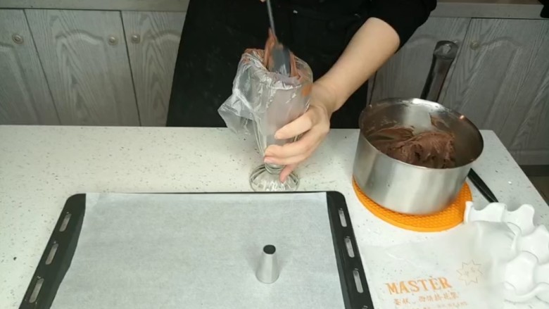 20. 面糊装袋,裱花嘴就选大号的圆口,我们做的大泡芙,要用1cm以上的
