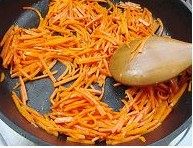 3. 锅中倒适量油,油热后下入胡萝卜丝,炒三四分钟,至胡萝卜丝变软。
