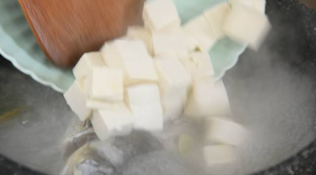 8. 大火烧开后,加入豆腐,转中火炖煮10分钟