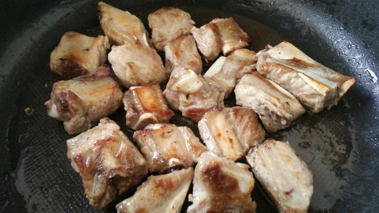 6. 排骨沥干水后放入锅中小火慢煎