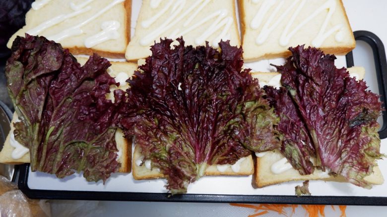 10. 生菜摘去根部,修成和吐司片差不多大小的铺在上面