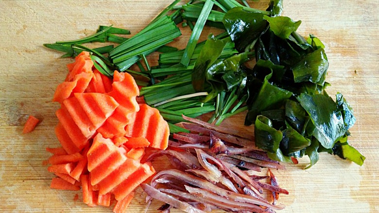 1. 准备食材。裙带菜提前泡发,鱿鱼耳是烤熟的。