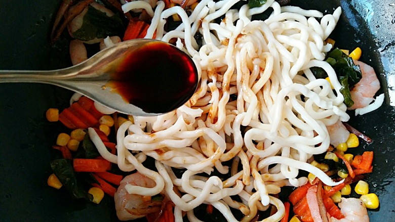 4. 翻炒均匀至虾仁变成红色,放入乌冬面。