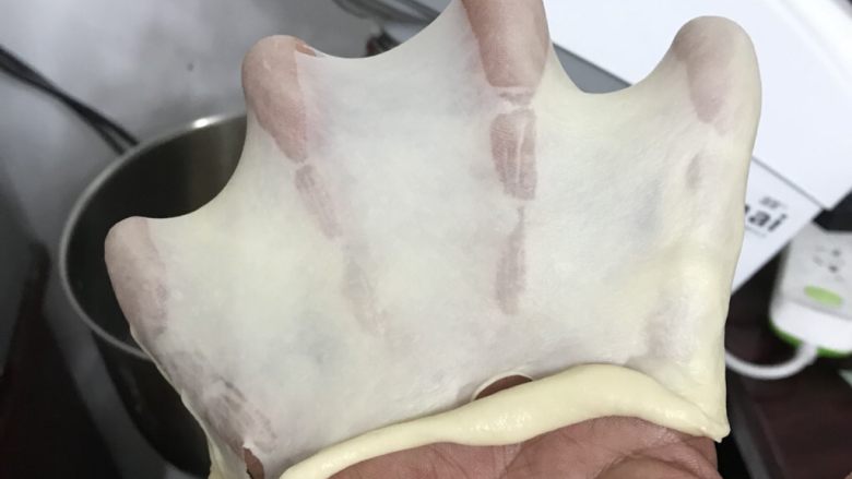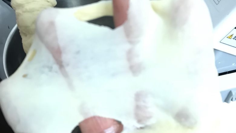 12. 二档把黄油揉进面团后转五档揉至接近完全扩展阶段也就是能拉出手套膜不易破的状态。