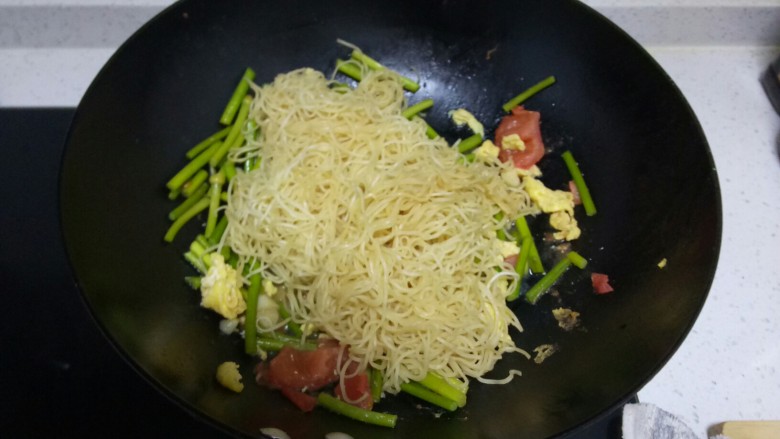 1. 锅中放入适量油,放入蒜瓣炒香,放入蒜台,快速翻炒至断生,加入适量耗油、鸡精、盐,搅拌均匀盛出,另起锅倒入适量油,倒入鸡蛋液,用铲子搅碎盛出,将西红柿倒入锅中,西红柿变软倒入鸡蛋,加入适量盐搅拌均匀,倒入蒜台、搅拌均匀。