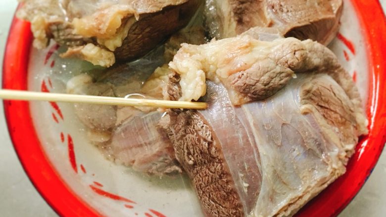 7. 汤水留着,将牛腱子肉捞出,过冰水。 顺便用牙签或叉子在牛腱子的筋膜上,扎一些小孔。 (预防熬煮的时候,缩得厉害)