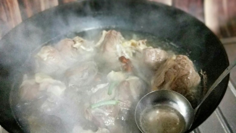 6. 大火烧开后撇出沫子。(其实用冷水反复泡过的牛腱子,即便是煮开后,也不会有很多沫子的) 转小火慢煮,将牛肉煮熟,煮烂即可。