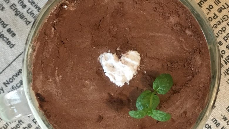 14. 用干净白纸剪出心形 撒上糖粉 然后移开白纸 插一朵薄荷叶
