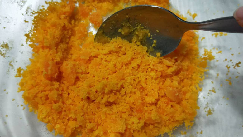 2. 用勺子将烤好的咸鸭蛋黄碾碎。