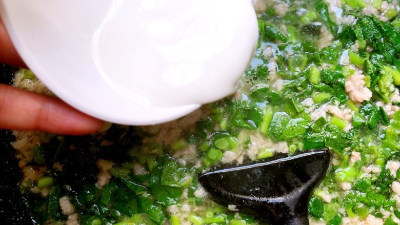 冬寒菜肉末羹,倒入水淀粉把水再次煮开,要不停的搅拌,等到汤变的粘稠就可以了
