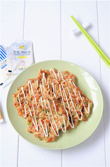 - 2、各种食材和面糊稍微拌拌,无干粉即可,不用拌太久,以免面糊上劲,饼的口感变硬。