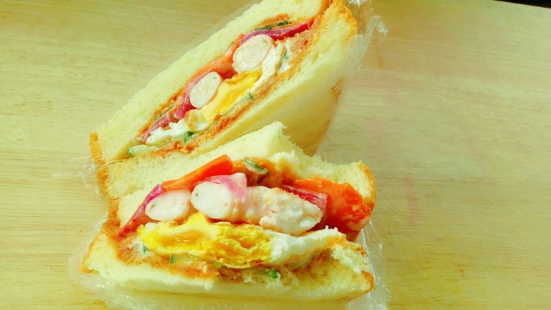 16. 取出切开食用,可以头一天晚上做好,第二天早起拿着上班路上吃。料多多,里面夹的东西可以发挥自己的想象,根据自己的口味想吃什么夹什么(自己做的吐司就是好吃😂)