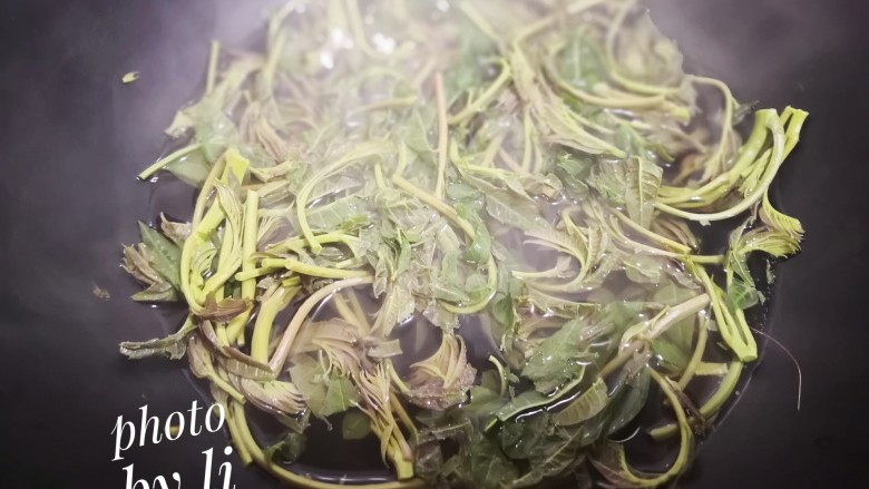 3. 水烧开后,把香椿嫩枝入锅焯水,颜色由红变绿,出锅,过凉水。
