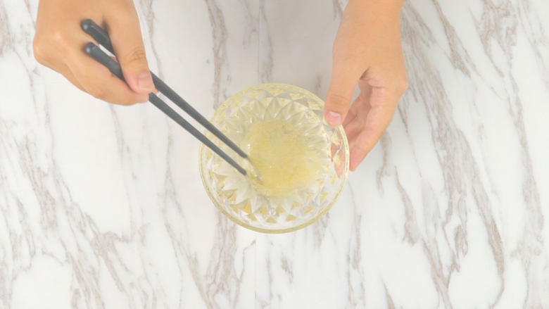 4. 黄桃糖水100ml加入吉利丁液5ml,搅拌均匀