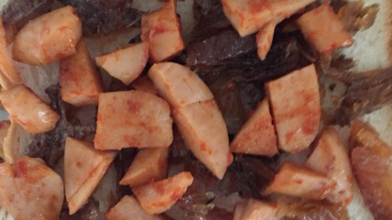 7. 拿出微波炉的火腿,炒炒