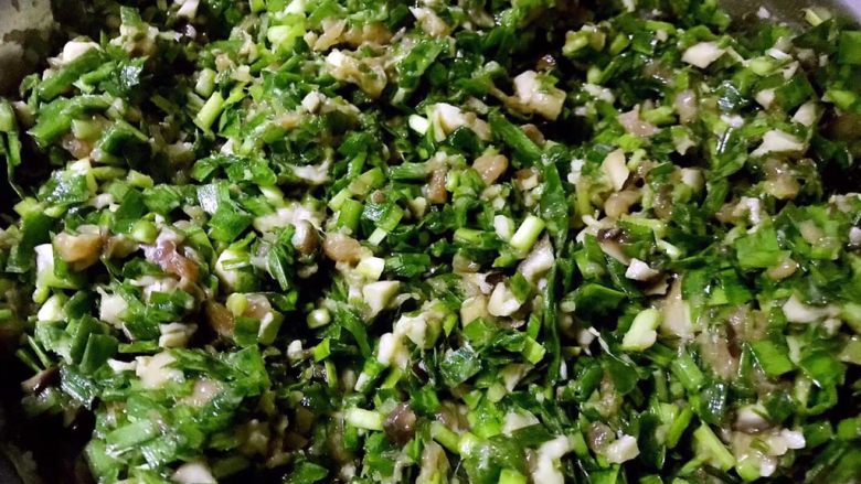 4. 香菇去蒂洗净后焯水熟了立即放入冷水中过凉后沥干水份剁成小块,虾仁切成小块一起和煨制入味的肉馅韭菜放入容器中放入油、盐、味精拌匀调好饺子馅
