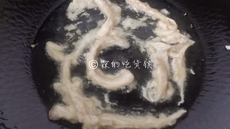 11. 起油锅,油锅六成热的时候,把平菇一条一条的放进去,炸至两面金黄就可以了