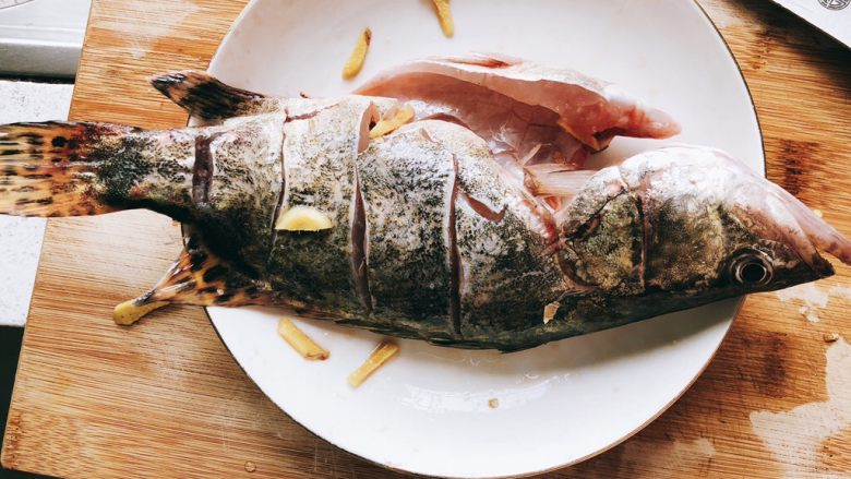 5. 姜切丝,放到鱼里,加入半勺盐、2勺料酒,抹匀鱼身后腌制30分钟。