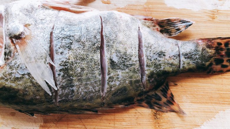 2. 先在鱼身上竖刀切4刀,切至鱼骨位置停止,不切断鱼骨。