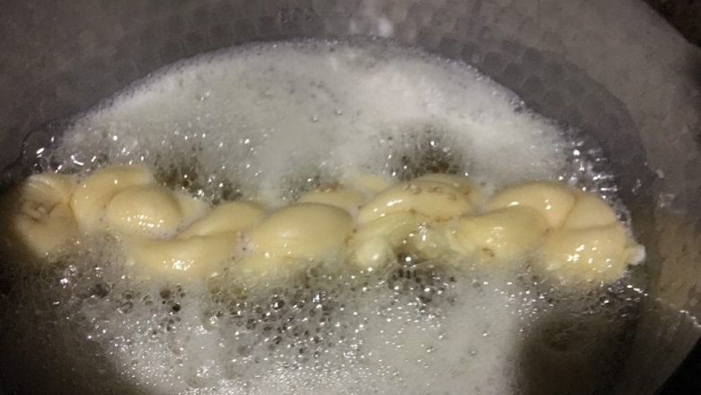 10. 锅里倒入足量植物油小火烧至六成热,放入麻花炸制两面金黄捞出控油