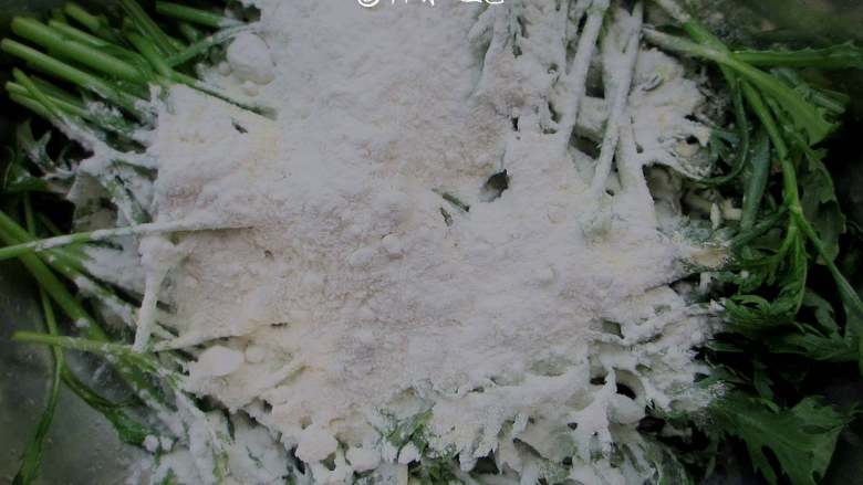 4. 用手抓匀至每根茼蒿都均匀的裹粘干粉