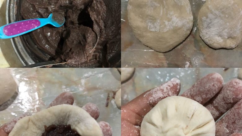 10. 取适量豆沙包入。醒发好的面很有延展性。随便捏,能包住就好。