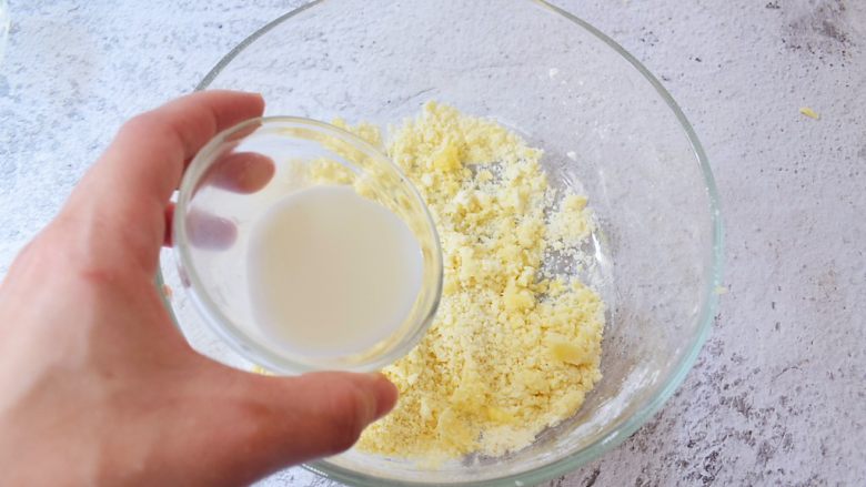 14. 加入白糖、鸡蛋、牛奶搅打均匀,再筛入低筋面粉搅拌均匀