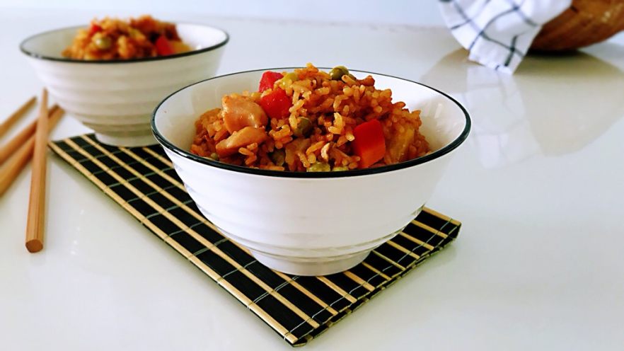 6. 倒入电饭锅的米饭上面,加入清水,清水的量和电饭锅中食材保持平面就可以。启动煮饭按钮键至机子自动停止工作。