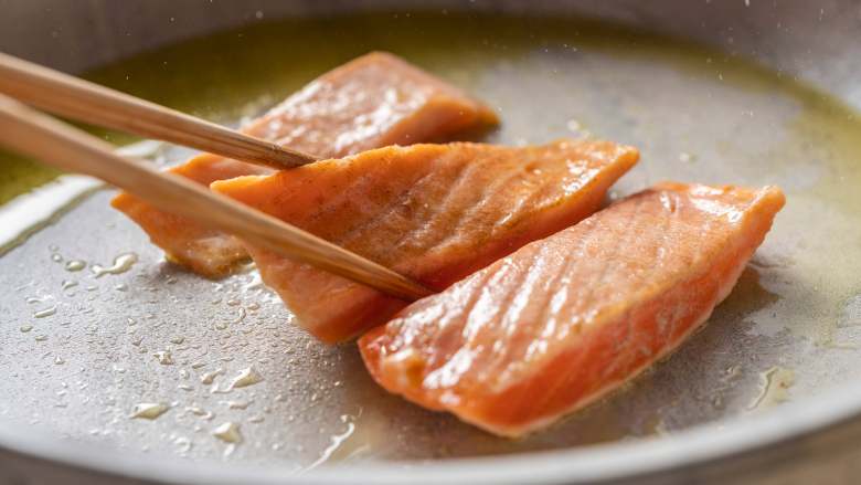 15. 最后把白酱倒入三文鱼块中翻拌一下,使鱼块裹上白酱就可以了。