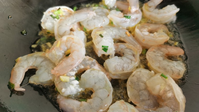 12. 倒入虾仁翻炒。