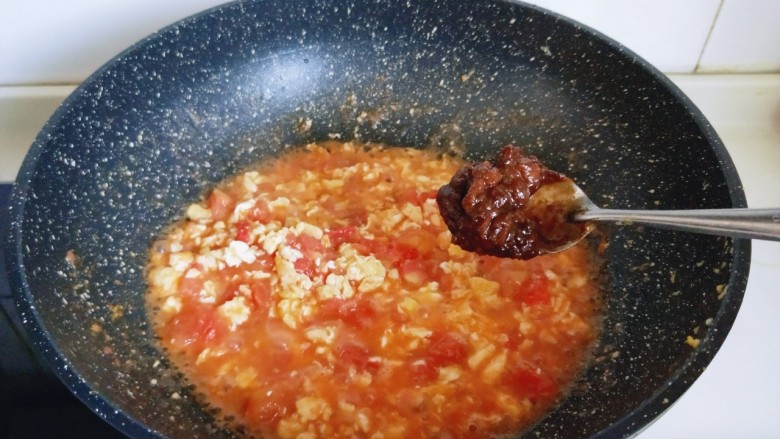 5. 加入一勺番茄酱,翻炒均匀,小火3分钟。