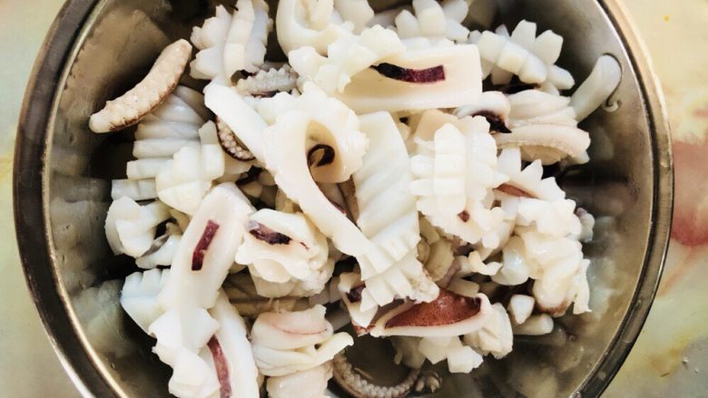 14. 鱿鱼也焯烫一下,看着变色稍微卷曲,就可以捞起来了。划花刀的鱿鱼很有卖相。