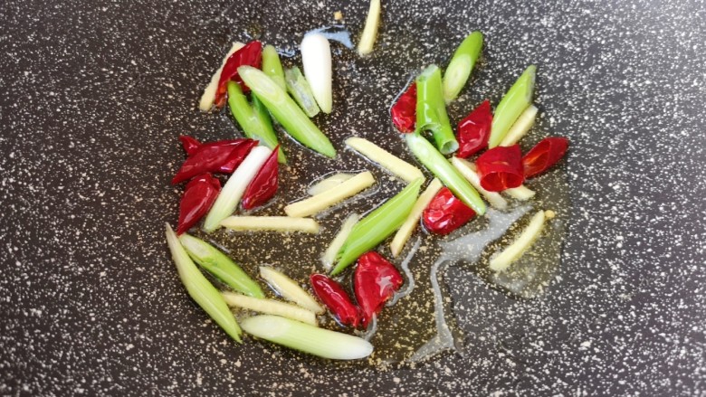 8. 炒锅内倒适量的食用油烧热,下入姜丝、葱段和干红辣椒炒香。
