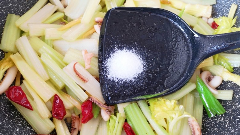 12. 翻炒一分钟左右,芹菜稍微变软。