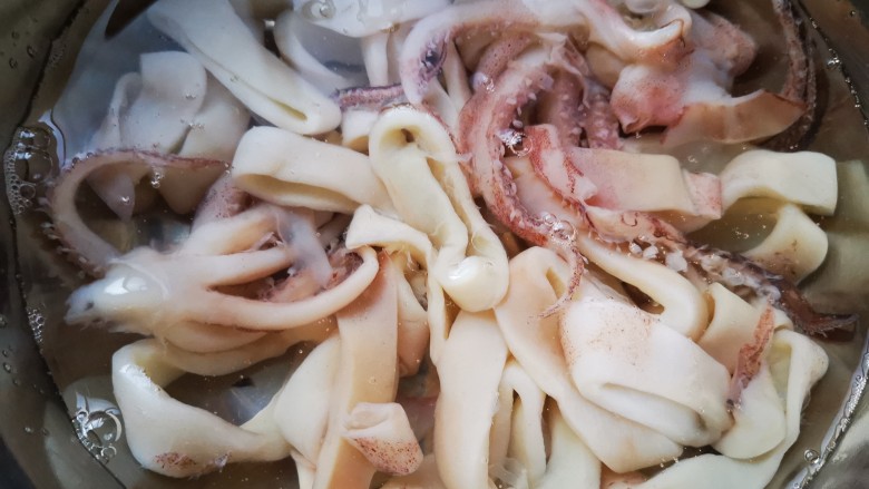 5. 锅中加水煮开,加少许料酒将鱿鱼焯水,捞起过凉水沥干水分备用