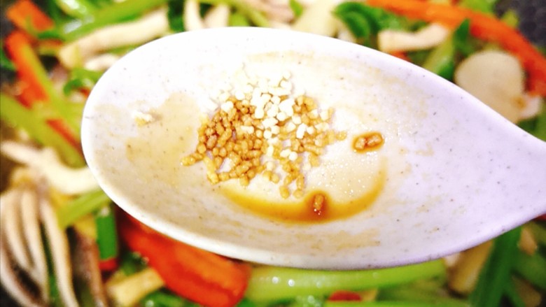16. 翻炒均匀,加一勺蒜蓉剁椒(个人喜欢辣一点的,可以不加)