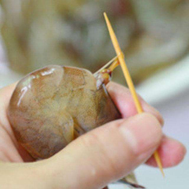 6. 虾头与身体之间的一节缝隙处用牙签挑出虾线,再用手轻轻拽出。