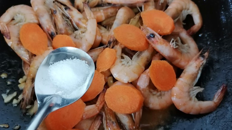 7. 放入基围虾翻炒