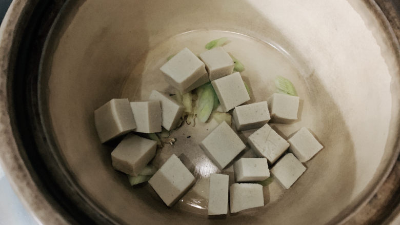 2. 选用千页豆腐是因为它耐煮,味道更佳,兼具弹性与细嫩的鸭血形成鲜明对比。切成骰子方块状。