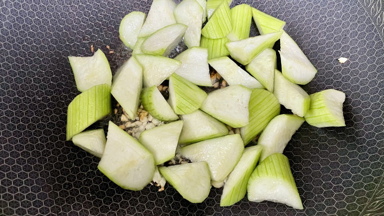 4. 下入丝瓜翻炒,整个过程保持小火。