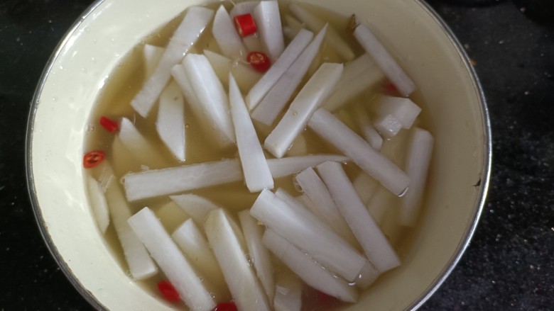 7. 罗卜条倒入泡椒水中,水要盖住罗卜条