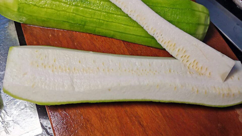 丝瓜皮是脆的,丝瓜囊是绵软口感,想凉拌它,就要分开行动,果然是井然有序,一点也不浪费,实用又美观。