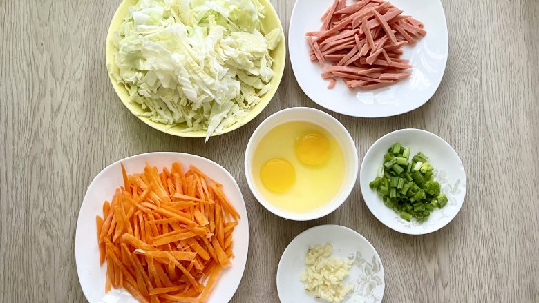 6. 下入包菜丝,和胡萝卜一起炒熟